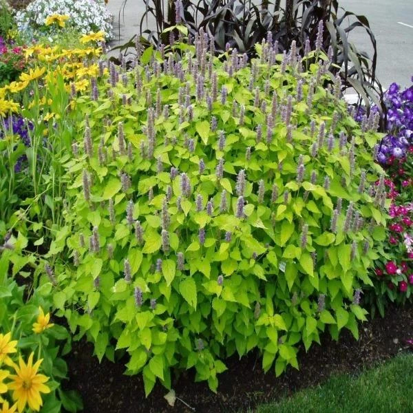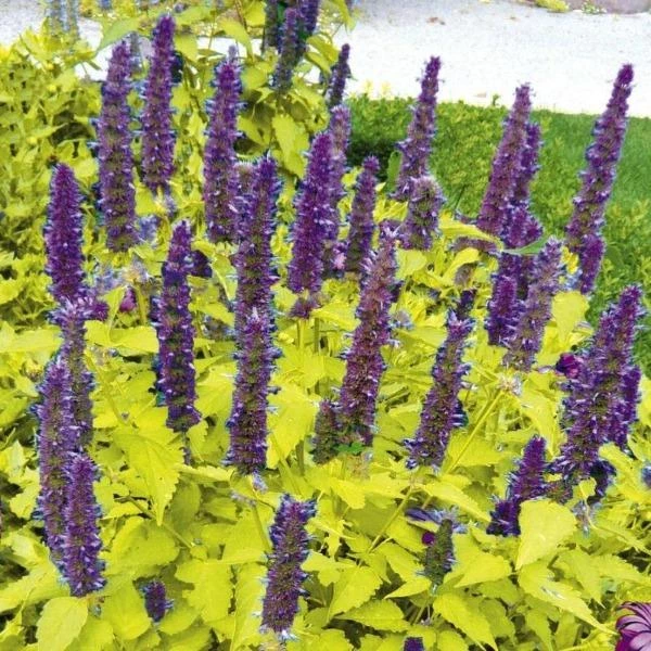 Agastache Golden Jubilee has chartreuse-colored leaves that are mint-scented when crushed or cut. The gorgeous blue flowers not only stand out against the yellow foliage but are irresistible to butterflies, bees, and hummingbirds. The large purple-blue flower spikes tower above the plant and make great cut flowers from summer into fall.