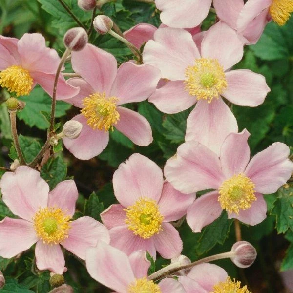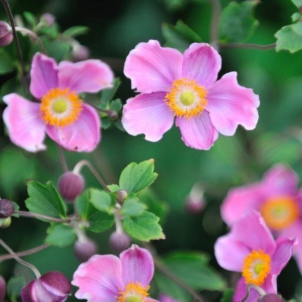 Anemone September Charm produces cupped, silvery pink flowers that are deep pink on the backside. Their flowers’ large petals surround bright yellow stamens. Your Japanese Anemone perennials will begin to bloom in late summer and last throughout the fall.