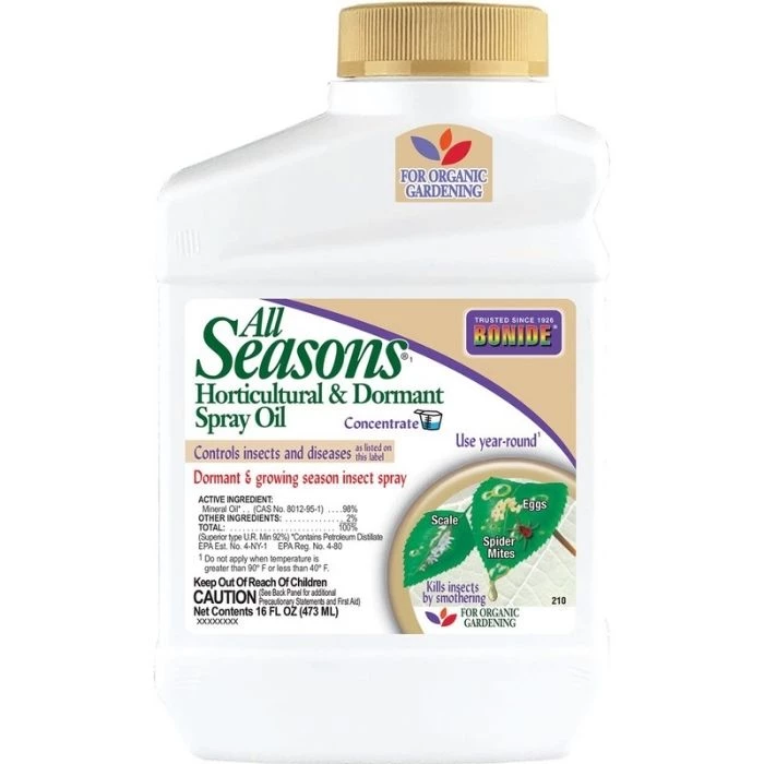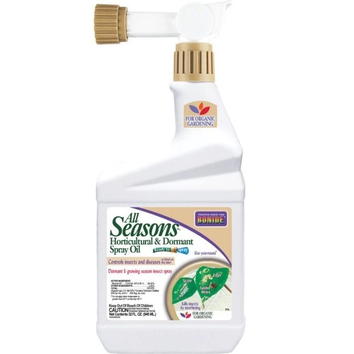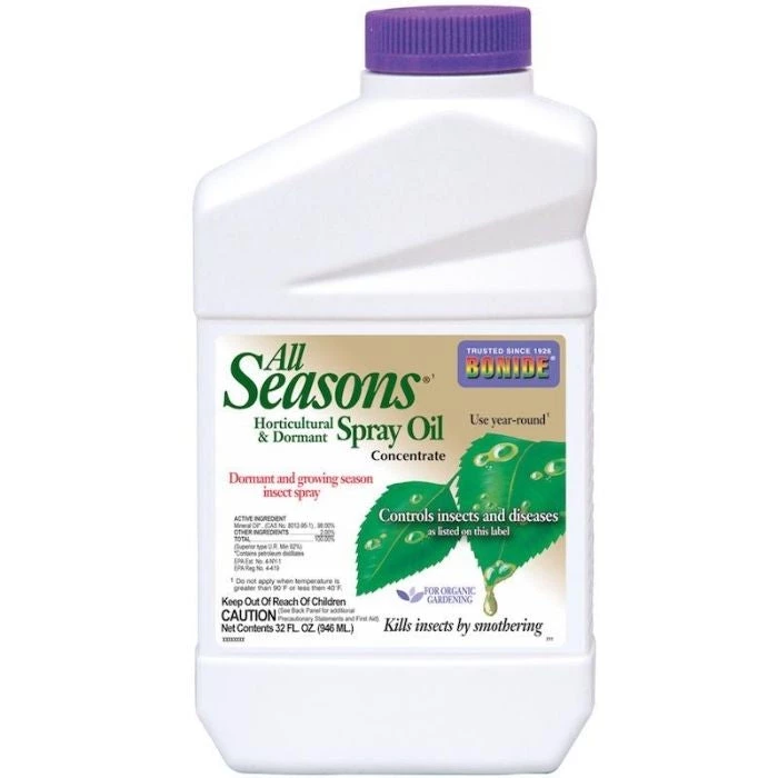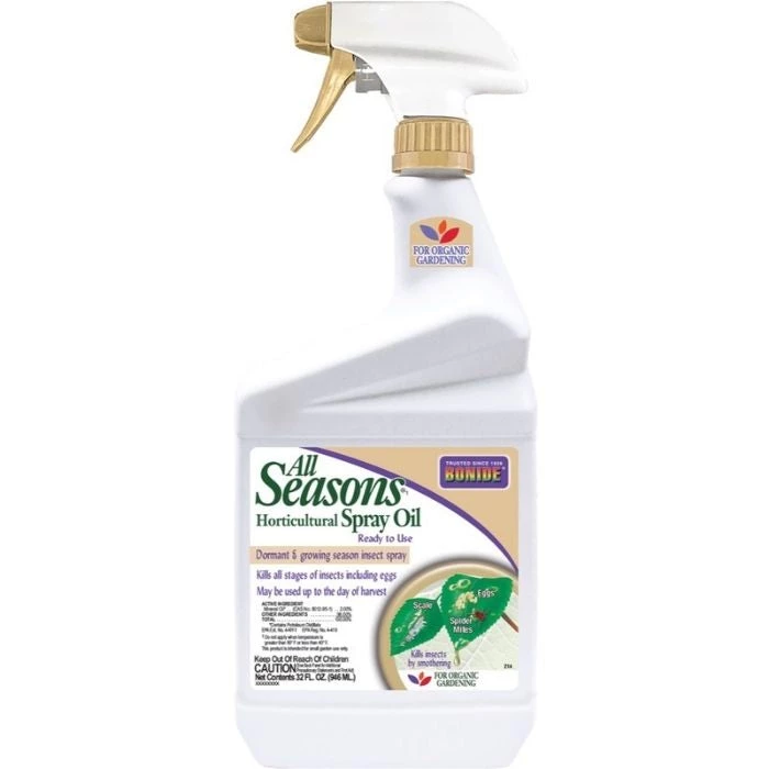 Bonide All Seasons Horticultural Spray Oil kills insect eggs and soft-bodied adults by smothering them. Works great indoors or out on aphids, whitefly, mites, and scale, and can be used as a dormant spray (no leaves) or delayed dormant (green tip) spray.