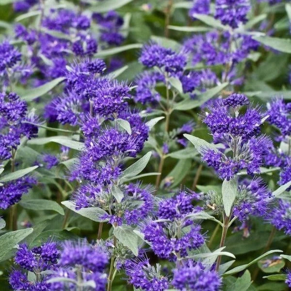 Caryopteris Dark Knight Shrubs are a compact, mounding shrub with dense, fragrant, silver-gray foliage and deep purplish-blue flowers over a long blooming season starting in late summer. The purplish-blue flowers attract bees, hummingbirds, and butterflies.