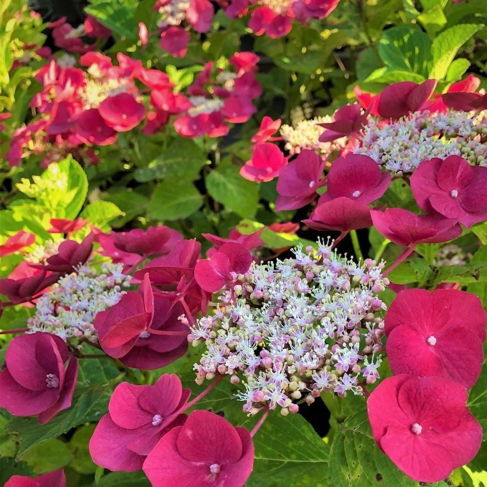 Cherry Explosion Hydrangea (Hydrangea macrophylla ‘McKay’) is the reddest hydrangea shrubs out there! One of the smallest hydrangeas on the market, it rarely needs pruning. If you’re looking for a low-maintenance, compact flowering shrub with lots of color and little hassle, look no further. Cherry Explosion keeps its red color in most soils, developing only purplish centers in acidic soils. The lacecap blooms consist of a mound of cherry-red flowers that last through the entire flowering season, June thru September! Its lush foliage and plentiful blossoms create a stunning summer statement in any garden or landscape.