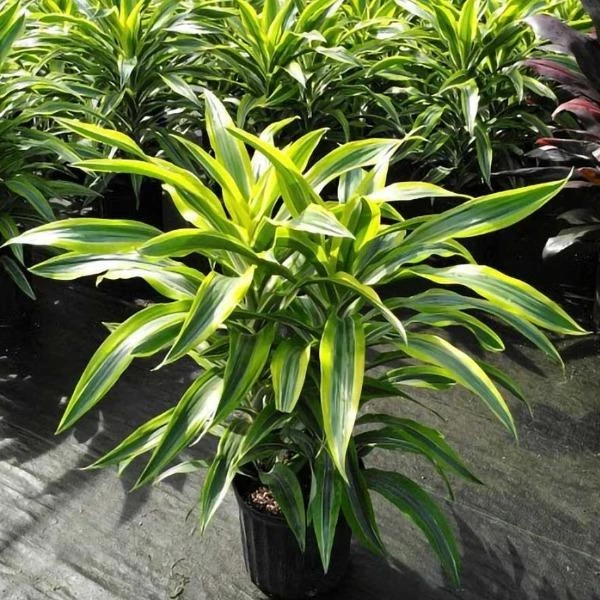 Dracaena Lemon Lime is a bright, zippy house plant that cleans the indoor air of toxins. The colorful stripes of green and white variegated leaves are broad and arc slightly, creating a graceful display of foliage.