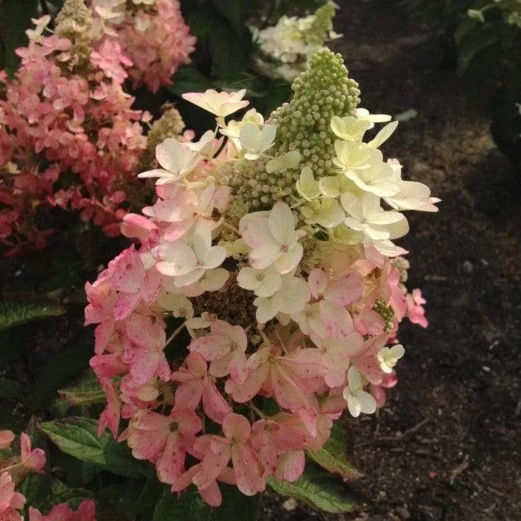 HydrangeaFlare flowers open pure white like most paniculata types but then turn pink, and will be an extremely light rosy pink in the fall. The chillier it gets the more vibrant the color. The flowers resemble a lava lamp or cone shape.