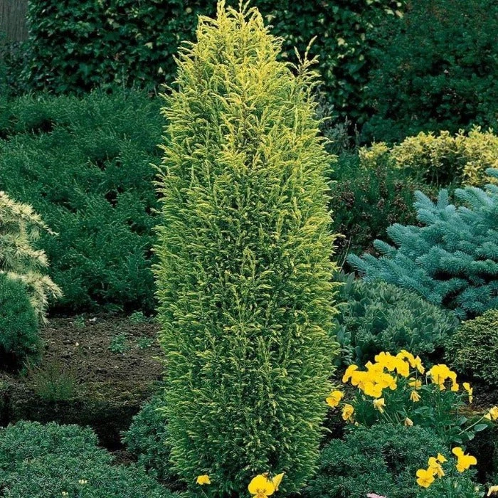 Gold Cone Juniper Shrubs have golden new growth that appears on this pyramidal, narrow, upright evergreen. Golden foliage gradually fades to blue-green in winter. Slow-growing, easy to grow. Tolerates poor soil conditions. A great choice for smaller landscapes, foundation plantings or in rock gardens.