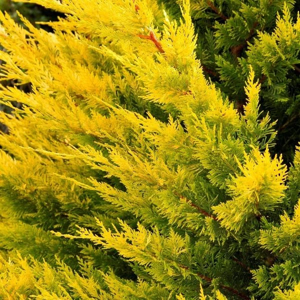 Gold Rider Leylands (Cupressocyparis leylandii ‘Gold Rider’) are perfect for spaces where you want all of the benefits of a Leyland cypress, but a smaller growth habit and bright vibrant golden yellow colors. Leyland Cypress trees grow 2 feet per year but they slow down around 10 feet high, then moderately grow to a maximum height of 35 feet at maturity. These vibrant trees work wonders as privacy trees, windbreak hedges, or specimen trees in smaller lawns and gardens. It holds the namesake golden foliage even in cold weather, perfect for winter interest gardens.