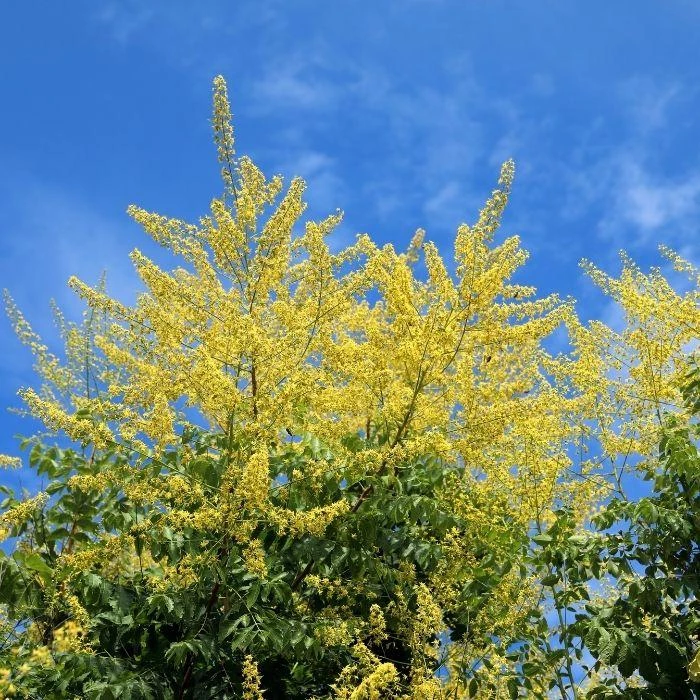 The Golden Rain Tree (Koelreuteria paniculata) is native to Asia and is historically planted near temples and places of remembrance. This tree brings with it a sense of beauty and grace, earning its name from the yellow flowers that fall from the tall boughs in late summer after their bloom cycle.