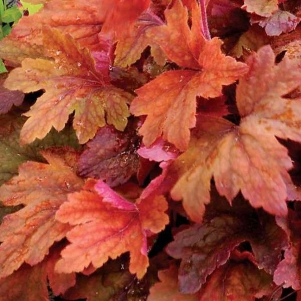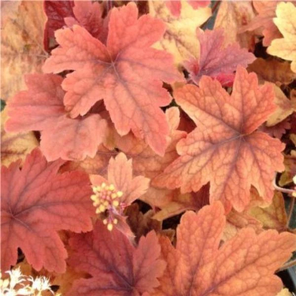 Heucherella Sweet Tea has intense color, unlike any other Heucherella. Their star-shaped leaves are a mix of red and light brown making these perennials perfect for gardeners going for a rustic cottage look. Their foliage grows in a compact clump and reaches about 2 feet tall and wide. In early summer, they bloom inconspicuous dainty flowers that spring vertically from the foliage.