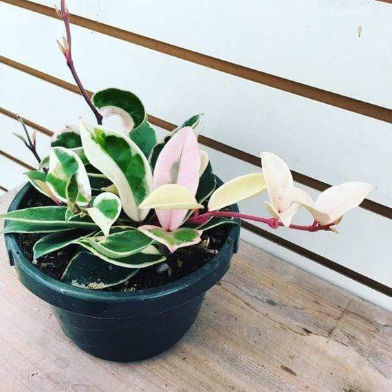 Hoya Carnosa Krimson Queen is an absolutely marvelous houseplant with variegated, green, bright pink and white leaves that emerge on cascading rope-like vines. The trailing and climbing nature of this plant’s waxy leaves make it ideal as a hanging plant or displayed on a trellis.