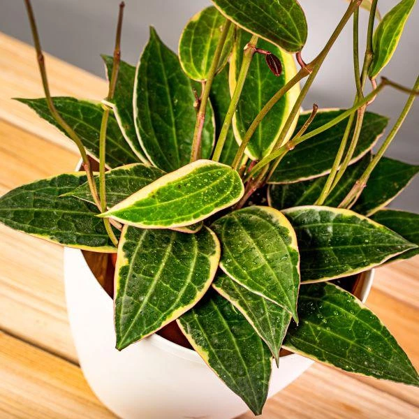 Much like the Hoya carnosa, the Macrophylla Variegata has variegated foliage that is wide and has distinctive creases in the leaves.