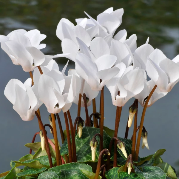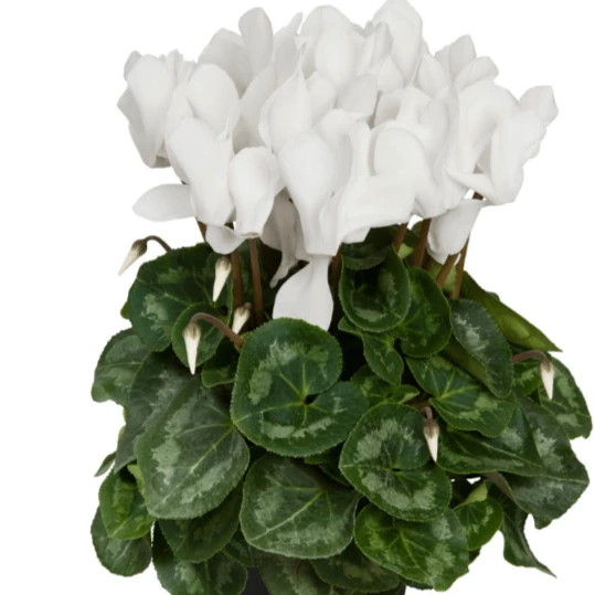 White Cyclamen does well with bright, indirect light and high humidity. These cheery wintertime flowers brighten up spaces indoors and look beautiful when placed in a matching brightly colored pot. The flowers have brightly colored upright facing petals that arise from below the leaves. The flowers vary in color from traditional red to pink, white, and several bicolors. White Cyclamen prefers moderately bright light and likes to stay moist without sitting in water or drying out excessively.