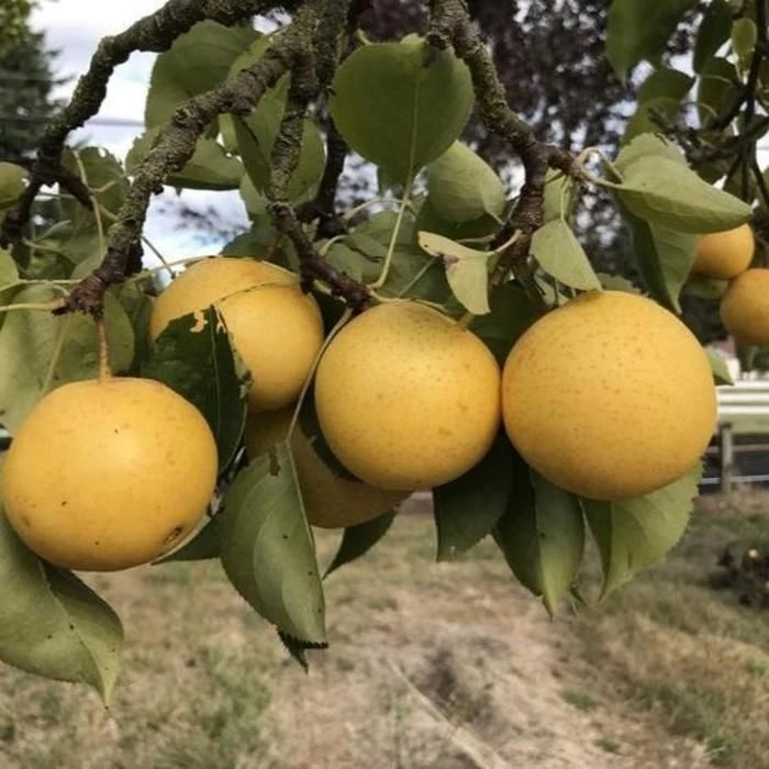 The Kikusui pear tree was brought to the United States during the California Gold Rush in the 1850s. This cute little fruit has a beautiful name that means “Chrysanthemum Floating in Water.” The floating chrysanthemum is also the crest of the Japanese royal family.