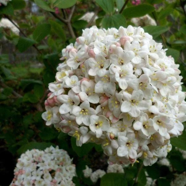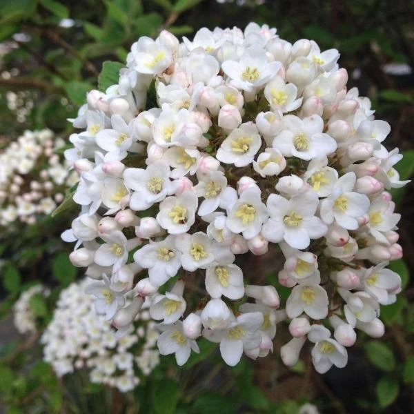 Korean Spice Viburnum Shrubs (Viburnum carlesii) is a truly breathtaking shrub when in bloom, clothed in snowy white fragrant flowers. It has attractive horizontal branching and good fall color, making it a fantastic specimen shrub. Korean Spice Viburnum is draped in stunning white daphne-like flowers held atop the branches in mid-spring.