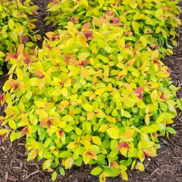 Magic Carpet Spirea is a neat, compact, mounded shrub with vibrant red new leaves and deep pink flowers. Clusters of small pink flowers contrast with bright gold mature foliage that turns rich russet red in fall. This extraordinary combination of colors will brighten and enhance any landscape. Certainly one of our favorite Spireas.