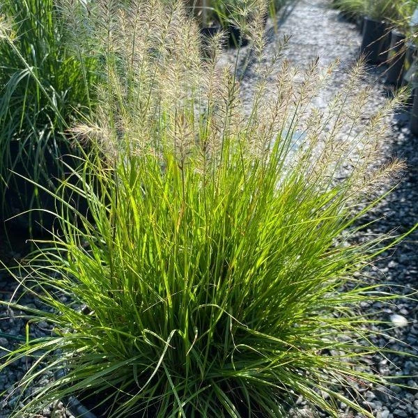Pennisetum Lumen Gold is a compact, mounding grass with year-round interest. In the spring, they produce arching gold leaves, and as they mature, the foliage turns to a lemon-lime color. Summertime brings light and airy plumes that soar above the foliage. When temperatures drop and fall arrives, these perennials turn to a golden-orange color that creates beautiful contrast when used among your garden shrubbery.
