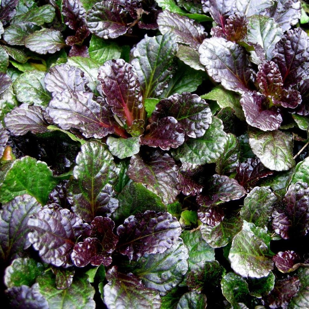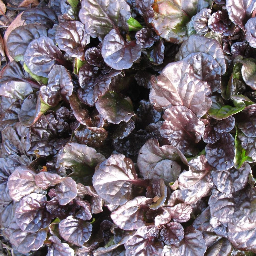 Ajuga reptans ‘Black Scallop’ or Carpet Bugle has fragrant blue flowers and very glossy almost black leaves with red stems. Flowers are produced in the spring. Powdery mildew resistant and easy to care for making it ideal for planting in containers, using as a groundcover, or planted between stepping stones.