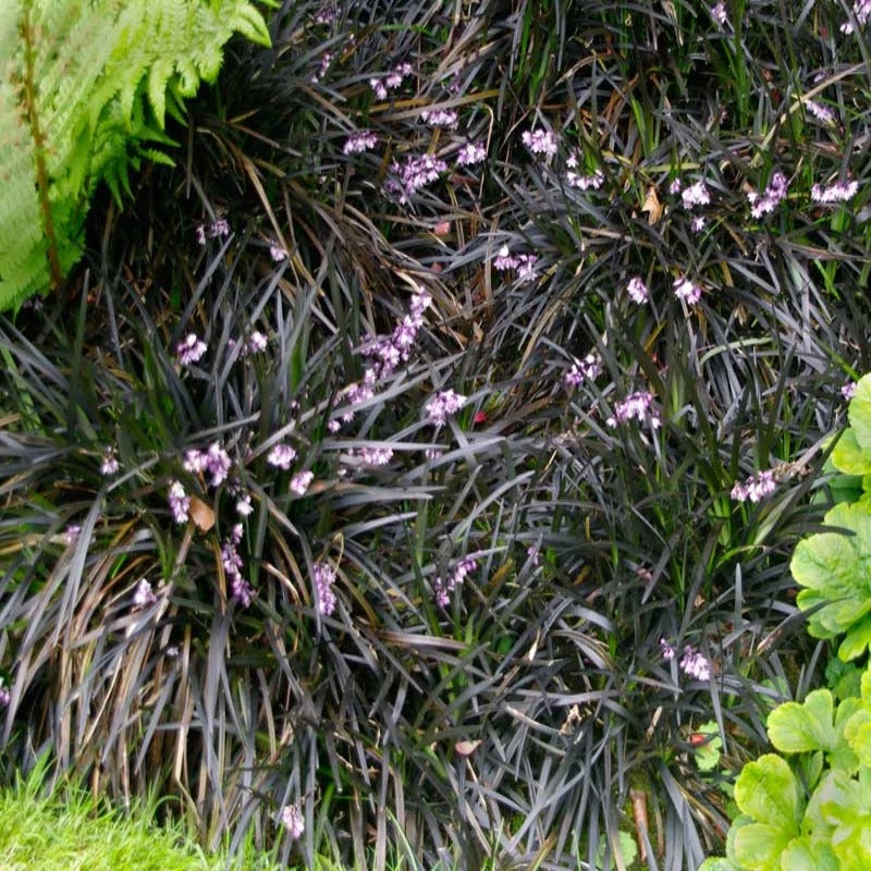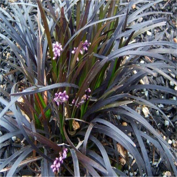 Black Mondo Grass creates stunning contrast along walkways or as an edger at the front of landscape beds. Ophiopogon produces dense, purple-black, grass-like leaves. During the summer months, dark lavender flowers burst forth from the dark clumps and are followed by purple berries that often last through the fall, creating additional interest in the garden.