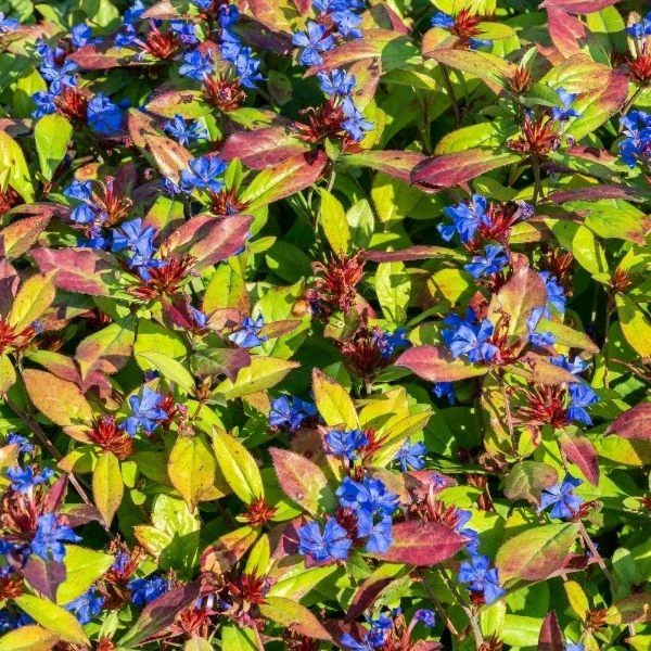 Ceratostigma plumbaginoides produces brilliant blue flowers with striking red calyxes that cover bright green foliage from mid-summer to fall when the leaves turn deep red. A wonderful groundcover, it is a great choice for beds of spring bulbs because it emerges late, as the bulb foliage declines.