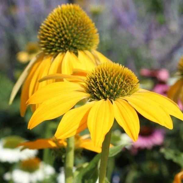 Echinacea Sombrero Lemon Yellow is a hybrid Coneflower that produces vibrant yellow flowers. Their petals overlap, giving these eye-catching blooms an even more enticing, fuller look. Like most coneflowers, the Sombrero Lemon Yellows prefer full sun and tolerate a wide range of soils, winds, and water levels. The bright yellow flowers look exquisite when planted en masse or paired with other purple and red perennials.