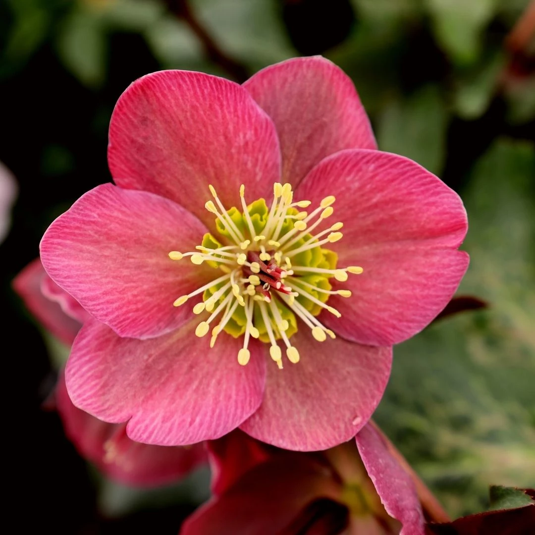 The Rosy red flowers deepen to a burgundy red color as they age. This deer-resistant, compact hellebore is a member of the Frost Kiss family of hellebores bred for better resistance to frost and cold. Leafy flower stems are held upright on lush marbled foliage that can be thinned in the winter to better enjoy the blossoms.