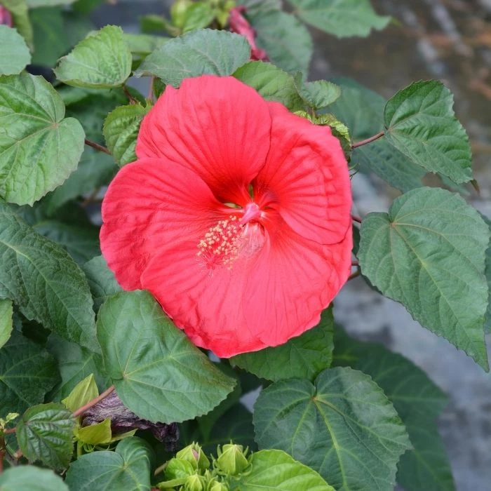 An especially compact variety, the Hibiscus Luna Red forms a medium-sized bushy mound of dark green leaves. Huge rich red saucer-shaped flowers appear in mid-summer and continue until frost.