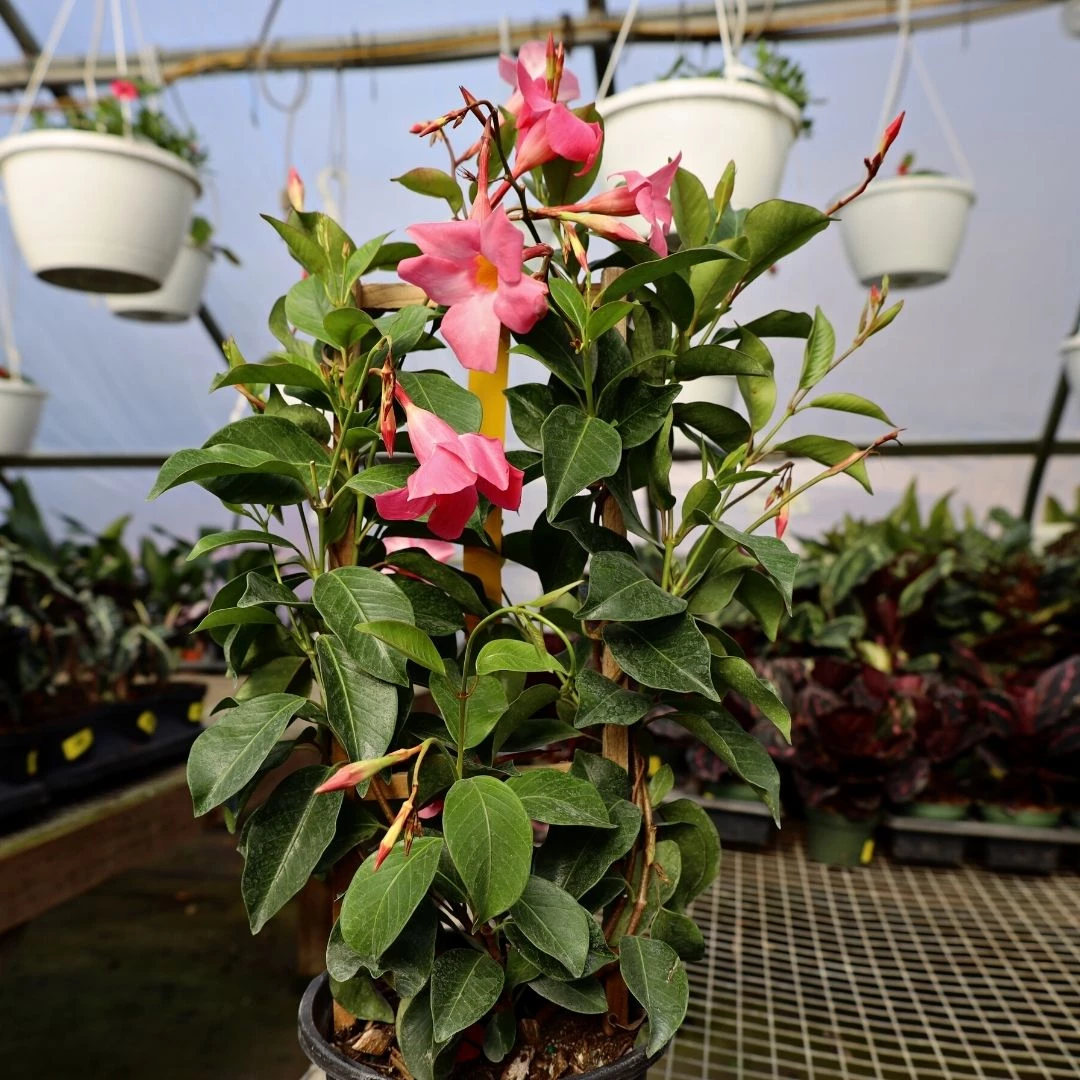 Pink Mandevilla (Mandevilla sanderi) is a tropical plant, known for its trumpet-shaped bold pink flowers and blue-green foliage. This tropical vine grows well with other flowers and can grow upwards of 20 feet. When planted in full sun and humid climates you will watch your plant thrive!
