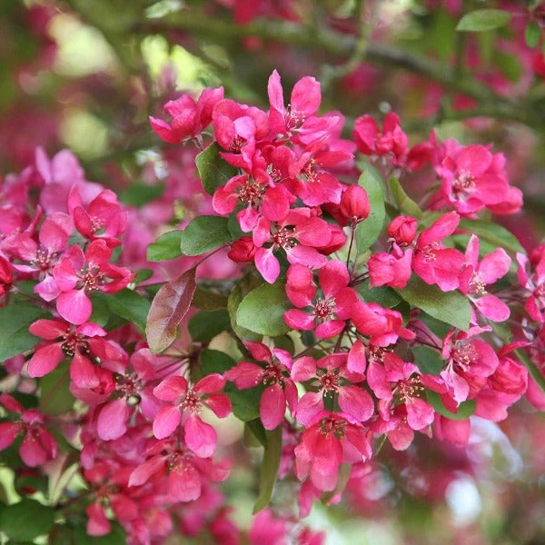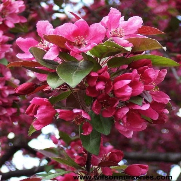 The Profusion crabapple tree is truly a profuse bloomer. The bronze-colored spring foliage fades to a bronze-green as it ages. The rich red flowers have a hint of pink in the center and the fruit colored is a warm maroon. The easy to grow tree grows to be around 20 to 25 feet tall by 20 feet wide at maturity. Birds are attracted to the fruit and will visit the tree throughout the summer into the early fall.