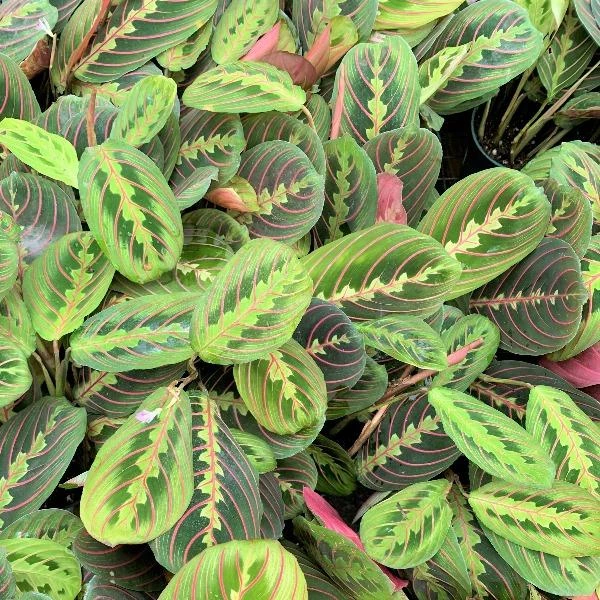 Red Maranta has round leaves with green and red striped upper surfaces and an underside of a maroon color. It has an elliptically shaped leaf with white accents. Very interesting foliage to say the least.