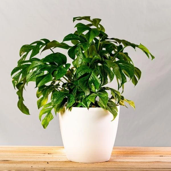Rhaphidophora tetrasperma has a climbing growth habit and vines beautifully when placed near railings, bookcases, or shelves. They become a fascinating visual focus when they climb as it brings the splits, or windows as they are called, up to eye level. Due to its tropical nature, this plant prefers humid air and bright, filtered light for optimal growth.