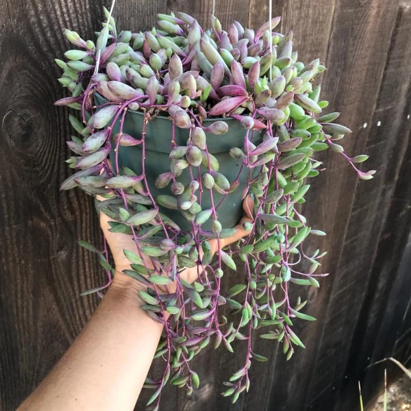 Othonna Ruby Necklace, also known as Ruby Necklace Plant or Othonna Capensis is a vining succulent plant with purple stems that lead to pinkish-purple and green leaves. Just when you thought this plant was interesting enough, it blooms tiny yellow flowers in the summer! This plant prefers bright light, so we recommend planting it in a hanging basket by a sunny window.