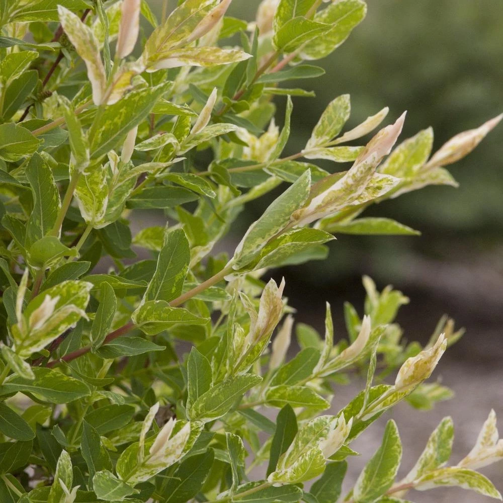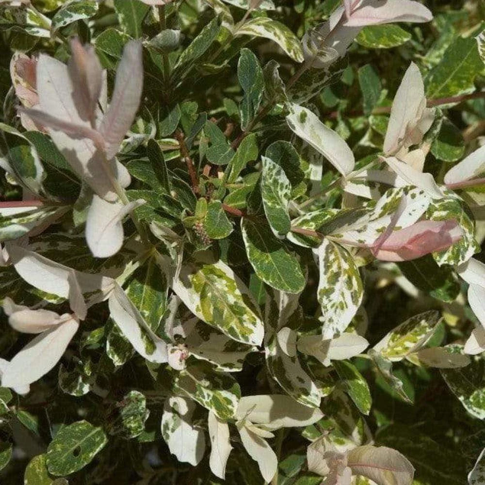 Bright pink shoots open to creamy white and green variegated leaves on this graceful willow shrub. Heavy fertilization will maintain its color. Dappled Willows can also be trained into a small tree and can usually be found in shrub and tree forms.