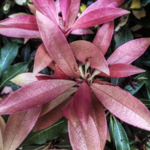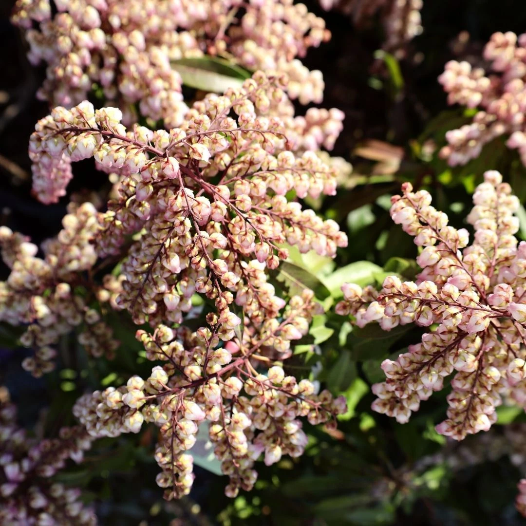 Pieris Katsura will continue to push new, richly colored foliage all summer long. Only as the foliage matures does it become very dark green. In early spring, long racemes of rose-colored flowers cascade over the evergreen foliage, radiating with a sweet floral scent.