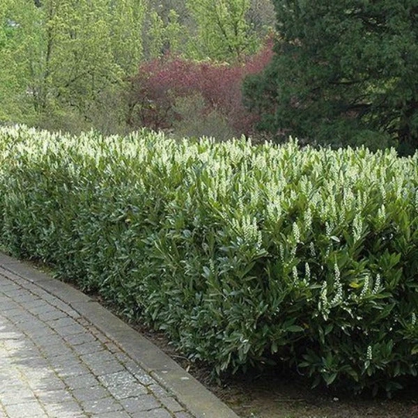 The Zabel’s dwarf Cherry Laurel is a good choice for those searching for a mid-sized privacy hedge. It does not grow as tall as the skip laurel and tends to get wider. It can easily be kept to shorter heights and skinnier widths with a once per year pruning.