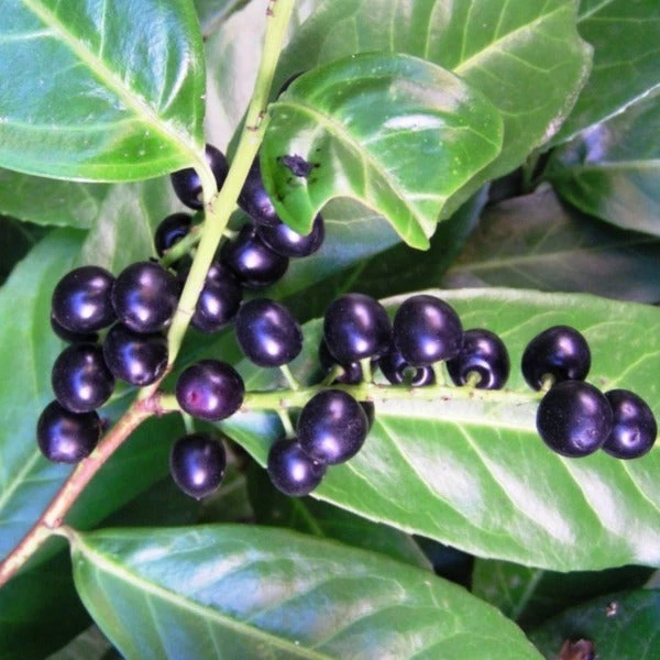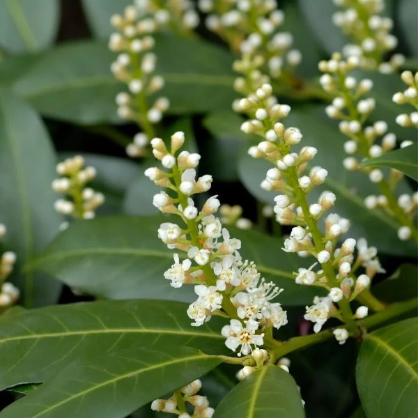 Zabeliana Cherry Laurel is a more compact version of the skip cherry laurel. Growing more horizontal when young, this evergreen shrub becomes more mounded as it ages. The dark green foliage remains even in the toughest winters in zone 6. The clusters of fragrant pure white flowers of this dwarf Cherry Laurel bloom in spring and are followed by small black berries in summer.
