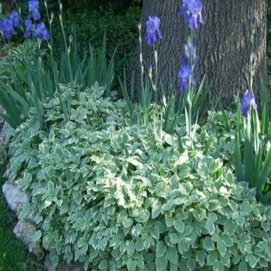 Snow on the Mountain is a popular variegated groundcover that quickly forms a dense, weed-proof carpet, even under challenging growing conditions. A good choice for sites where nothing else seems to succeed, such as under shallow-rooted maple trees. Especially lovely in containers.