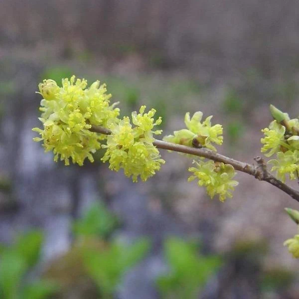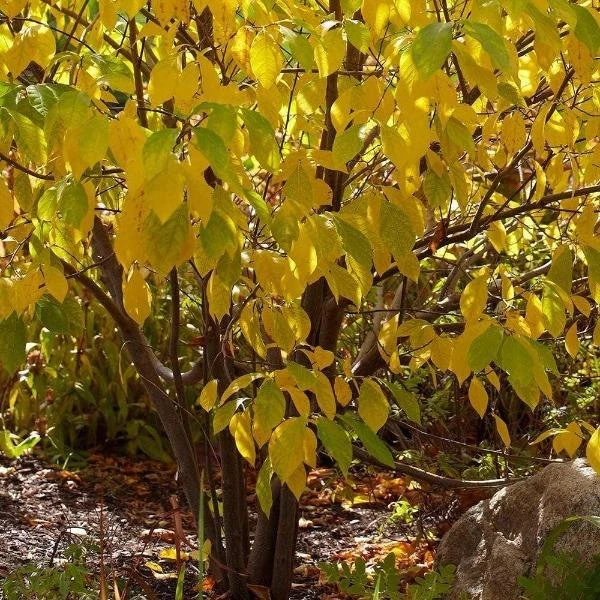 Spicebush or Lindera benzoin is a deciduous shrub that can grow up to 15 feet tall at full maturity. This shrub is native to rich forests, dry forests, or slopes. It gets its nickname, the Nothern Spicebush, from the fiery odor that fills the area when its dried leaves are crushed. The bark is a walnut brown color that is speckled with white. These trees are sensitive to heat and drought, so they do best in shrub borders or woodland areas with lots of moisture and shade. In the fall season, the leaves become golden-yellow, bringing an autumnal and warm feeling to your landscape.