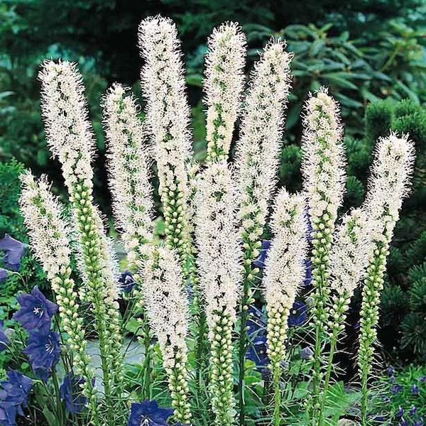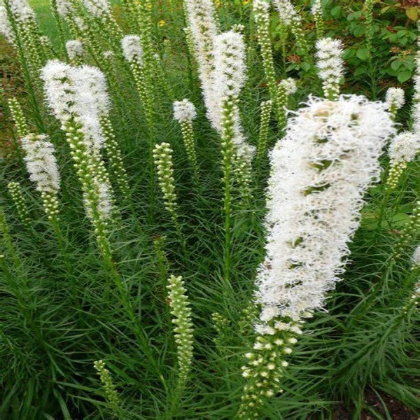White Liatris plants start blooming from the top of the flower spike and bloom downwards until there is one sizeable colorful spike of color.