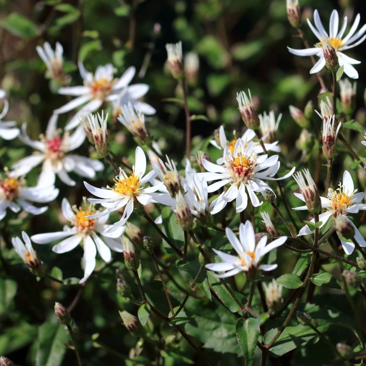 Unlike most other species of Fall Aster, White Wood Aster is suitable for shady sites. A North American native wildflower, this grows well under shrubs and at the edge of woodland gardens. It forms a low mound of bright green leaves, bearing upright stems of small white daisies, held on dark stems. Also tolerates sunny locations, and will naturalize well in the woodland or meadow garden. Although not yet widely grown, this species deserves much wider use in North American gardens and landscapes.